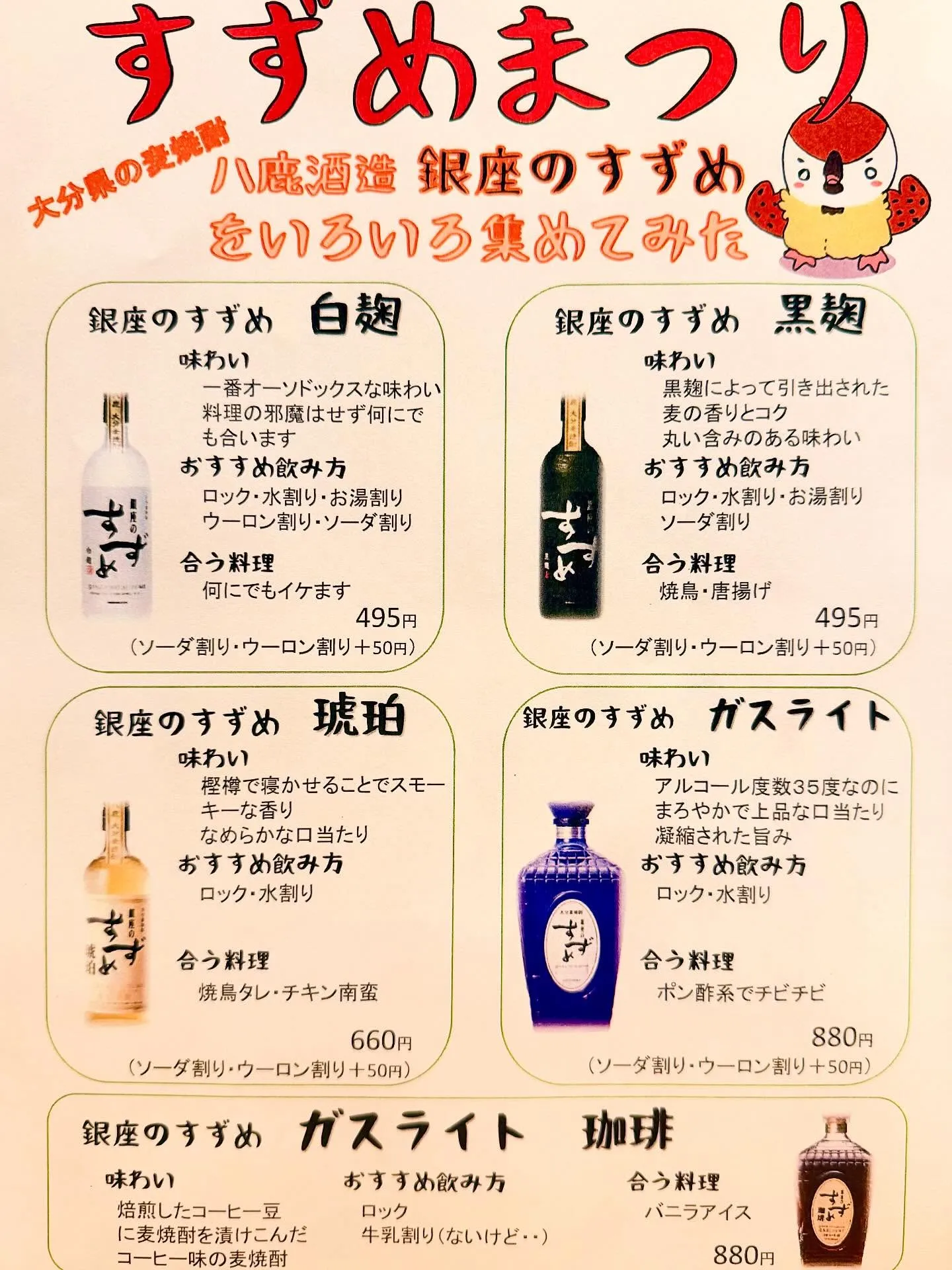 【すずめまつり】 2025/10/24 【すずめまつり】 個人的好きな酒蔵さん「八鹿酒造」の麦焼酎“銀座のすずめ”をいろいろと集めてみました!すずめはすずめでもあんなすずめやこんなすずめ....飲み比べてみてくださいまし #炭火焼鳥匠 #千林商店街 #千林 #千林大宮 #焼鳥 #炭火 #大和肉鶏 #麦焼酎 #大分 #八鹿酒造 #飲み比べ